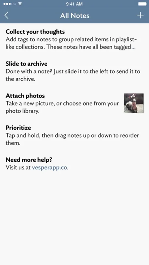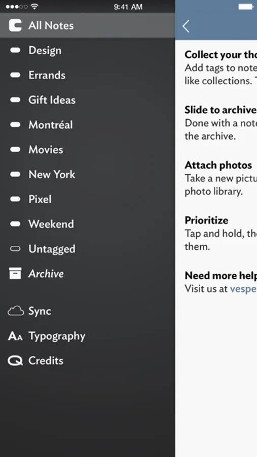 Vesper is a simple and elegant tool for collecting notes, ideas, things to do — anything you want to remember. Organize your notes whatever way comes naturally to you, without complications. Vesper's focus is on how it feels to use.