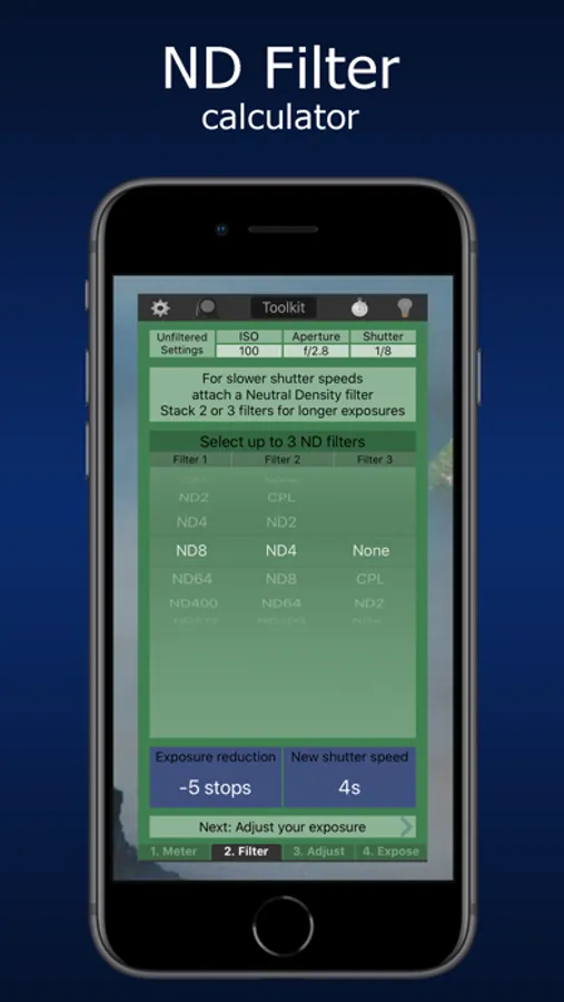 Just follow the ND Calculator's simple guided process to meter the scene and accurately calculate the camera settings that you'll need to use with your ND filters attached.