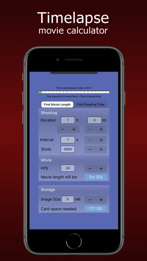- A Timelapse Calculator - calculate movie lengths, shooting times and storage space from shooting interval, frames per second and image size