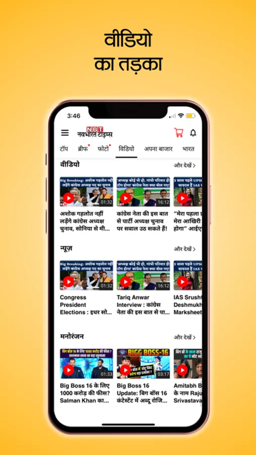 -Latest and Trending Video News (लेटेस्ट एंड ट्रेंडिंग वीडियो न्यूज़): NBT app offers news videos for the users. They can watch videos from entertainment, sports, astrology, business, tech & more.