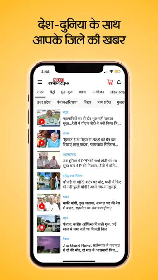 NBT Hindi News App offers all the latest news from local cities, states, National and all across the world in Hindi. Read national & international top stories, news headlines (मुख्य समाचार) in Hindi. Navbharat Times app is owned by Times Internet limited that provides a wide range of news in Hindi like India news, world and international news, social trending topics and viral news, election news, crime news, education news, jobs alerts, daily horoscope (दैनिक भविष्यफल) and rashifal. Also get updated with entertainment news from bollywood, hollywood, celebrity gossips and movie reviews on NBT Hindi news app (एनबीटी हिंदी समाचार ऐप). Navbharat Times news app also provides sports news (खेल समाचार) from cricket, IPL, football, tennis, hockey, Olympics, commonwealth games, and all other sports in Hindi. Users also get news updates about their own city like New Delhi, Lucknow, Mumbai, Patna, Jaipur, Bhopal etc. and states like Delhi, Uttar Pradesh (UP), Bihar, Madhya Pradesh (MP), Rajasthan, Punjab etc.