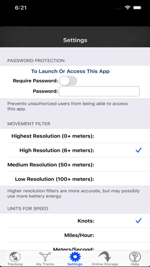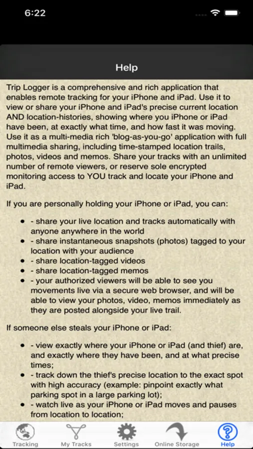 This GPS Tracking app includes a free 2-week online storage subscription to allow sharing and accessing tracking data remotely. Other duration subscriptions are available via in-app purchases.