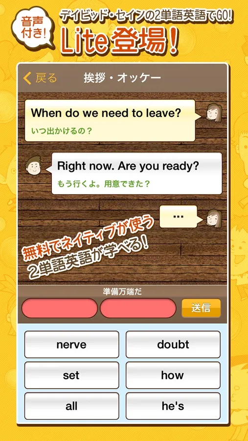 Choose answers such as: (準備万端だ)"All set."、(さあ、わからない)"Beats me." from multiple choice selection lists.
