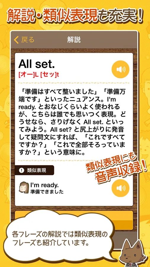 •Each phrase has associated phrases with similar meanings, such as: “All set” , “I’m ready.”