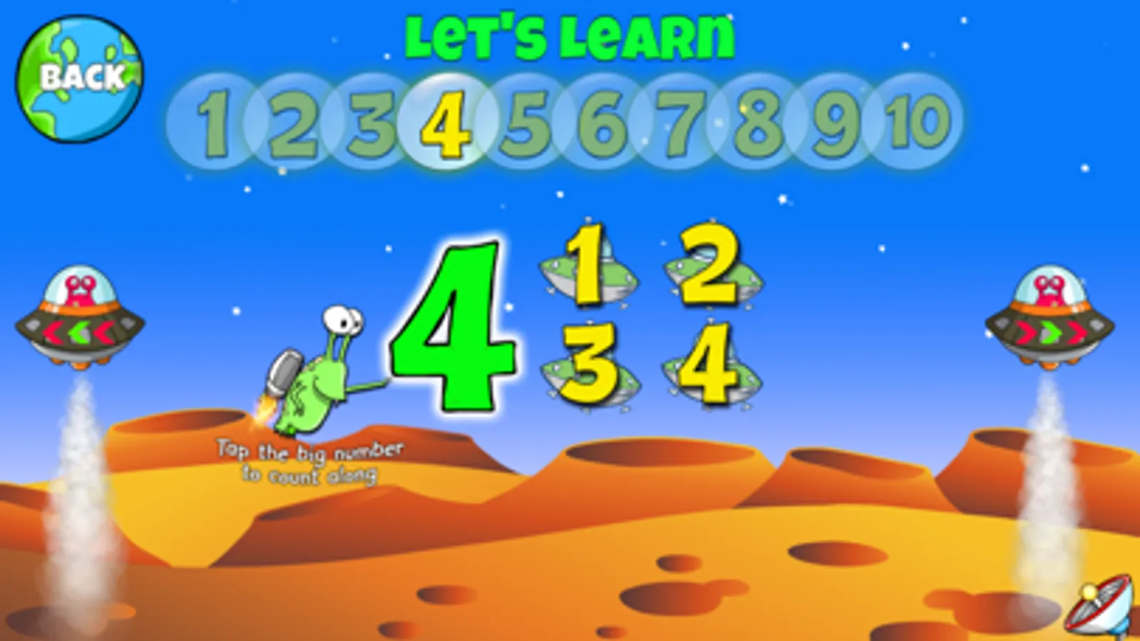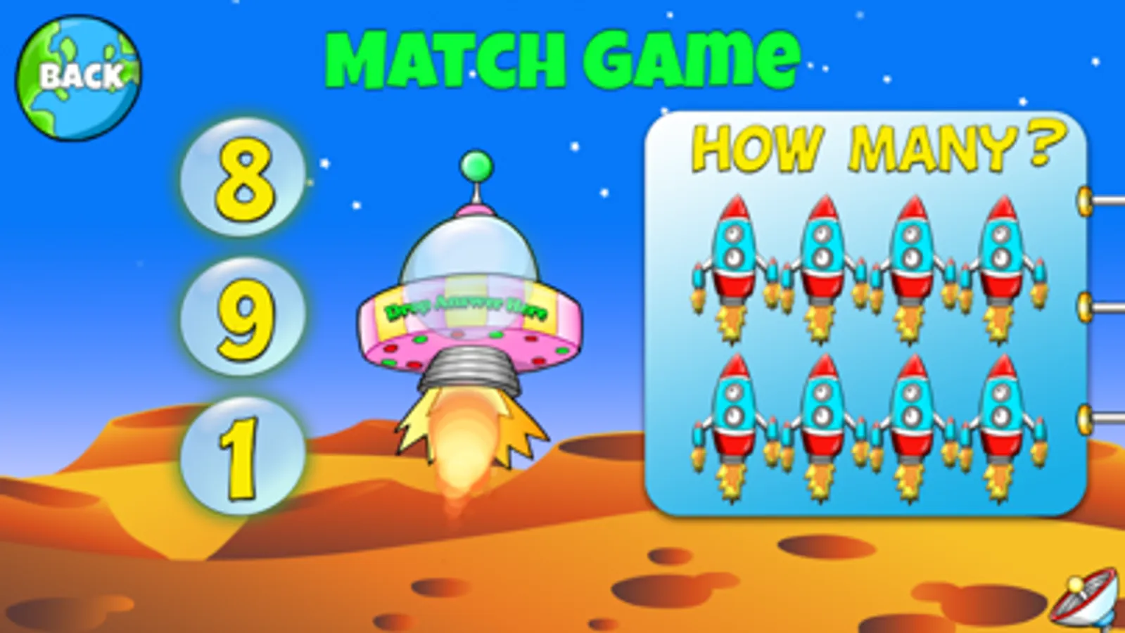 - Teaches children to count objects, then match them to the correct number by dragging the bubble number to the flying saucer.