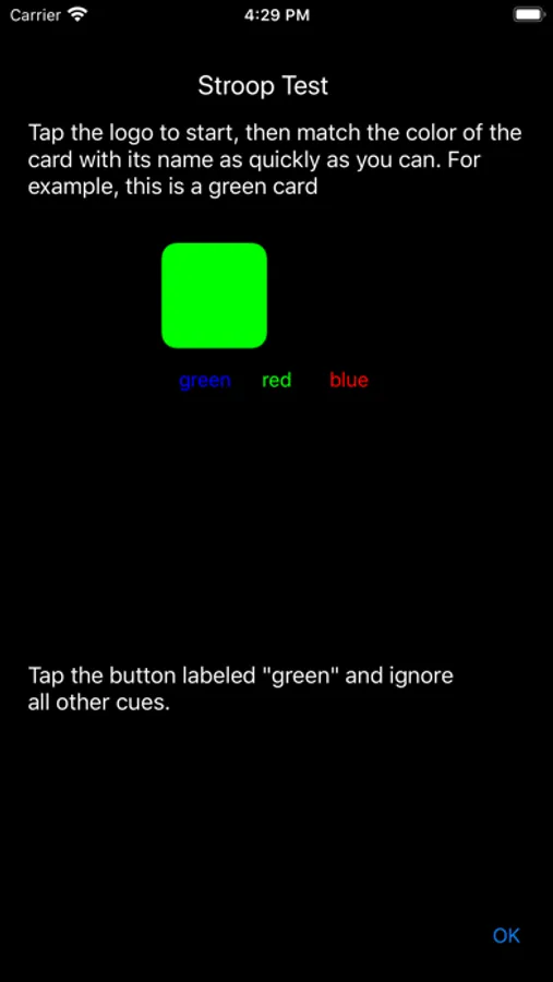 Designed for self-trackers, this is a quantified self app to let you quickly measure levels of concentration, focus, and attention. Based on the well-known psychological "Stroop Effect", you are presented with a series of randomly-colored cards, which you identify using labels displayed in a randomly-chosen color font. The more cards you can identify in a fixed period of time, the higher your score.