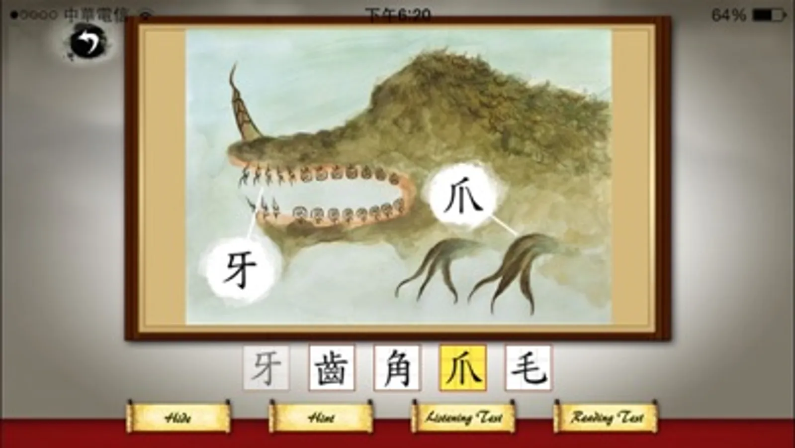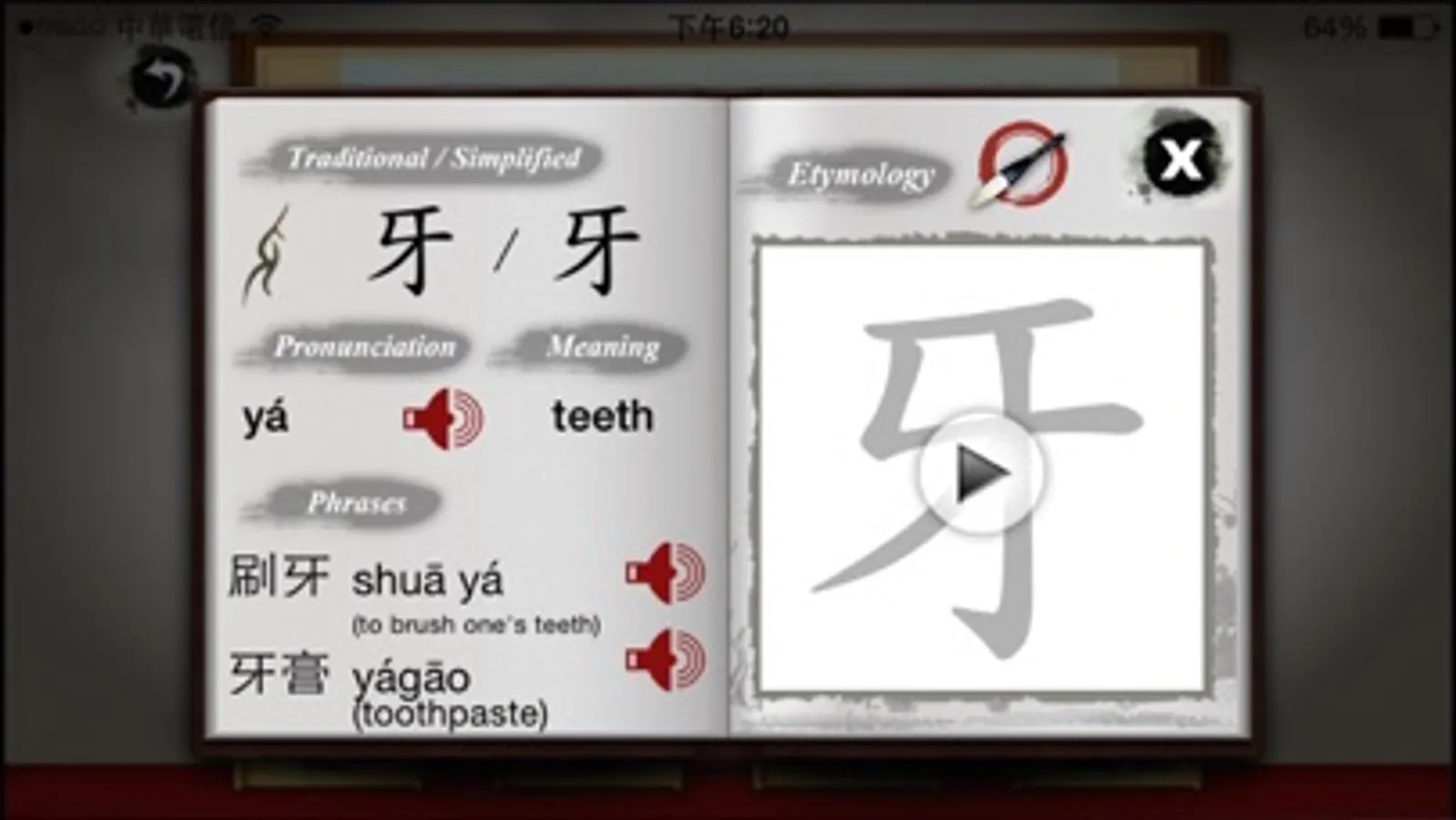 The most unique characteristic is to help you find clues in the paintings and dig into the pictograph. Through the way of image connection, you will realize Chinese characters are not just characters made up of unreasonable lines but with pictographic origins and meanings for every stroke. Furthermore, you will learn the most commonly used phrases and practice the stroke writing after the character recognition. These make you pleasantly acquire the knowledge of Chinese characters, the exquisite symbol of Chinese culture. Chinese learning is no longer boring!