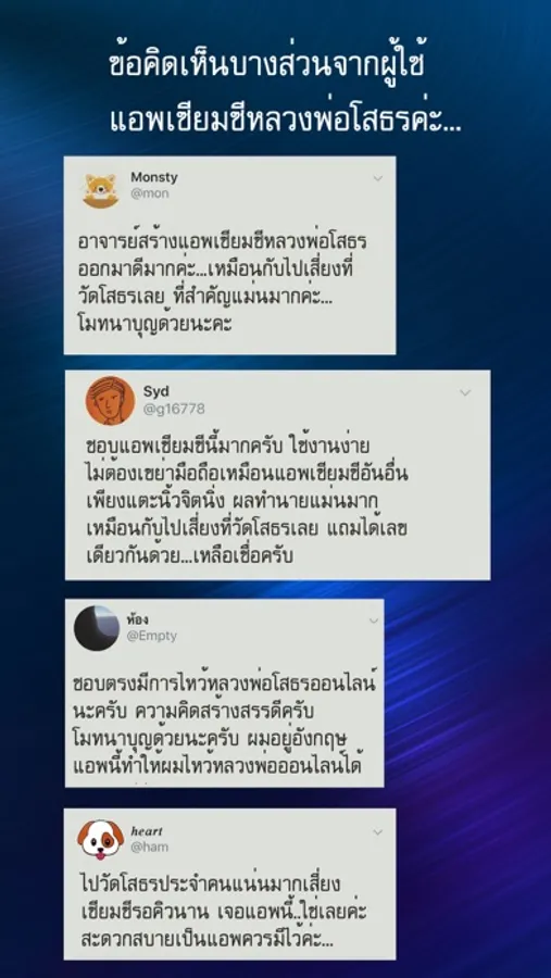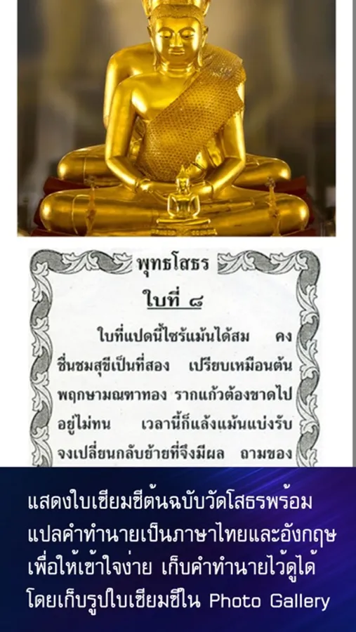 อาจารย์ได้แปลคำกลอนเซียมซีต้นฉบับของวัดโสธรเป็นภาษาไทยและภาษาอังกฤษเพื่อให้ง่ายต่อความเข้าใจ การใช้งานนั้นง่ายเพียงแต่มีจิตที่สงบอธิษฐานจิตและแตะที่ปุ่มสีแดงที่แอพเท่านั้นก็จะค่อยๆปรากฏคาถาหลวงพ่อโสธรให้สวดจากนั้นก็จะแสดงคำทำนายเซียมซีซึ่งแตกต่างจากแอพเซียมซีของที่อื่นที่ต้องเขย่ามือถือซึ่งทำให้เสียสมาธิได้ อีกทั้งยังสามารถเก็บคำทำนายเซียมซีไว้ดูได้ค่ะ