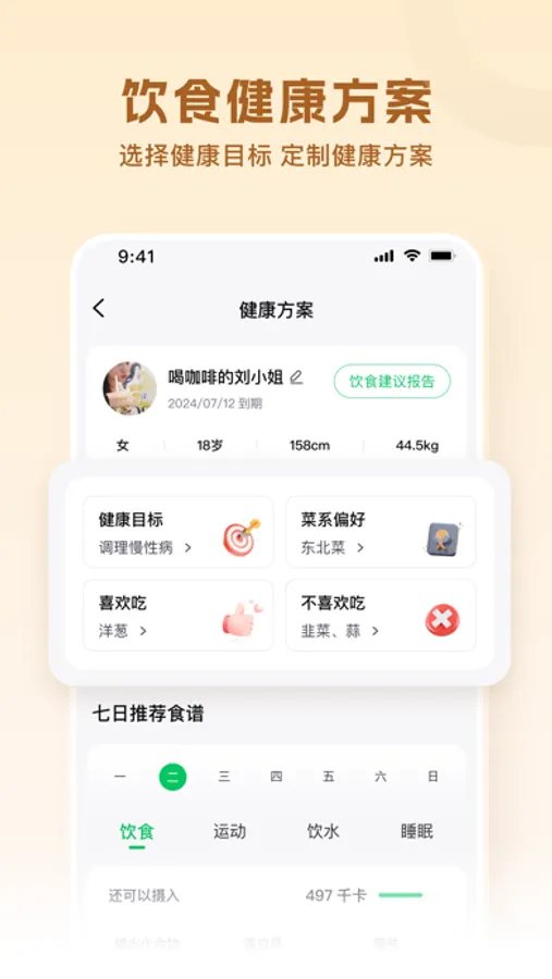 营养健康方案:基于你的个人信息与健康目标,为你生成饮食、运动、饮水、睡眠方案。