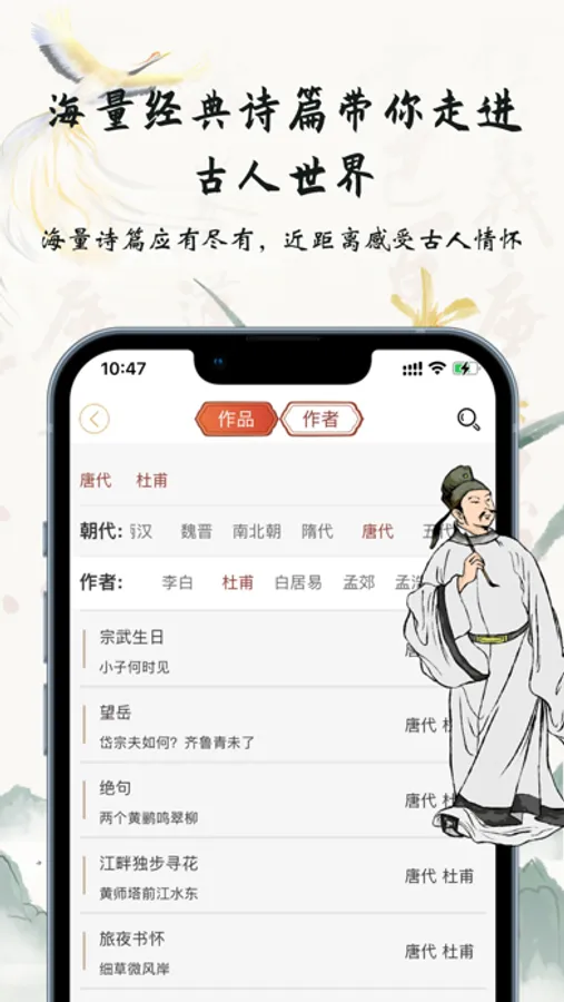 同时,【诗词赋】还拥有丰富的诗词藏品,按照不同的主题进行分类,内容解析有条有理。此外,我们还提供海量的诗词素材,涵盖写作、取名、祝福等方面,确保您在我们的App中能找到所需的一切。
