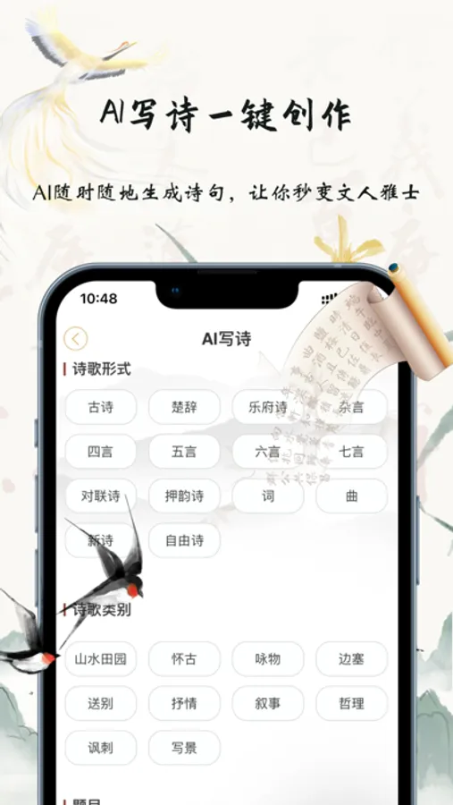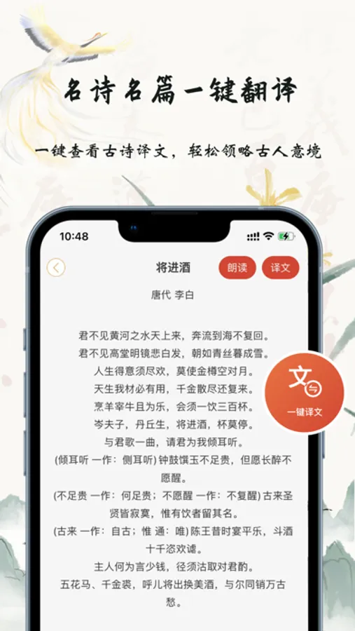 您将体验到独特的古风韵味和丰富多彩的功能。我们以精美的手绘水墨画、悦耳的古风音乐和华丽的动画视频为基础,将古诗词的情景再现,为您呈现一场视听盛宴。