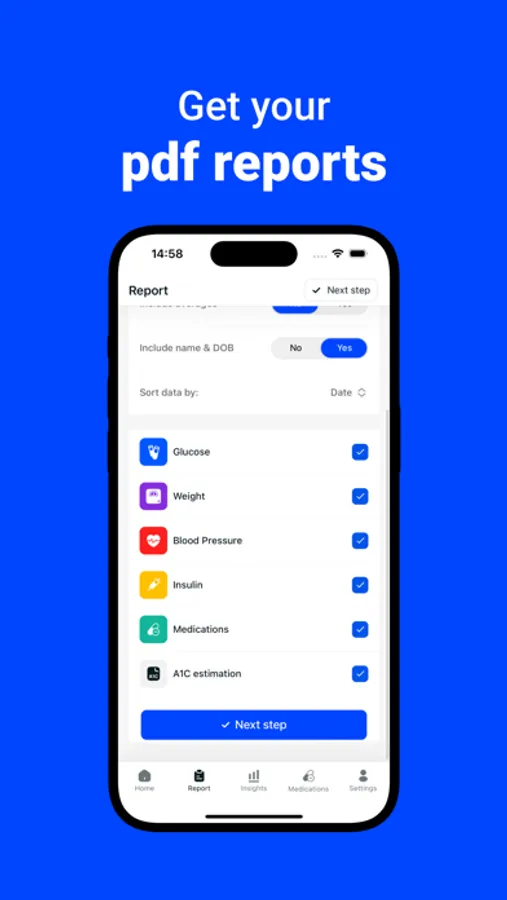 - PDF Reports: Generate detailed PDF reports for A1C, Glucose, Weight, Blood Pressure, Insulin, and Medication logs to share with your healthcare provider.