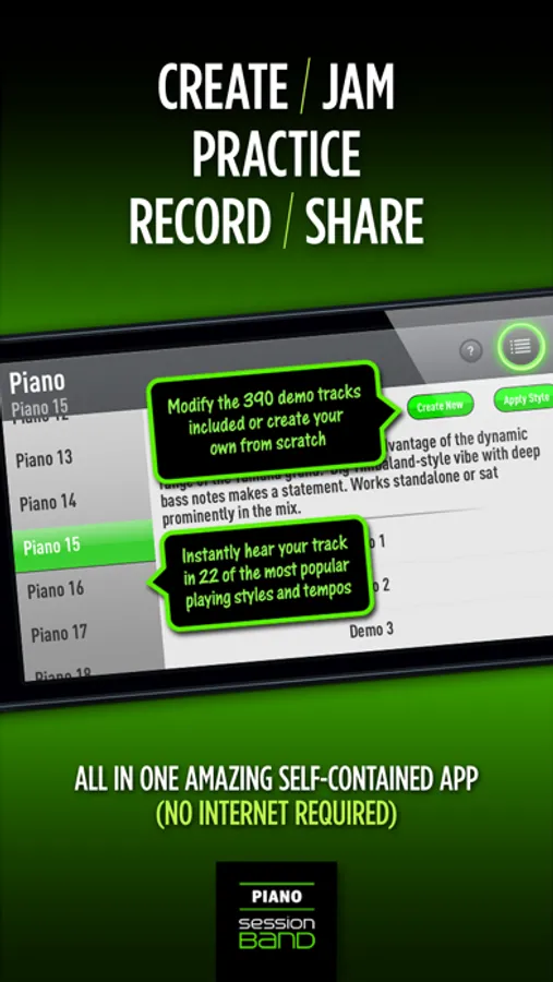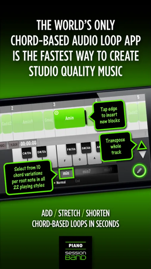 Create professional Piano backing tracks for any song in minutes with the award-winning SessionBand app - the world's only chord-based loop app.