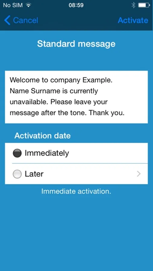 Diese Ansage verwenden Sie beispielsweise, wenn Sie einen oder mehrere Tage nicht erreichbar sind und keine Vertretungsnummer angeben wollen. Sie können das genaue Datum Ihrer Rückkehr eingeben. Der Anrufer kann eine Nachricht hinterlassen und ist gleichzeitig informiert darüber, dass er nicht vor dem erwähnten Datum mit einem Rückruf von Ihnen rechnen darf.