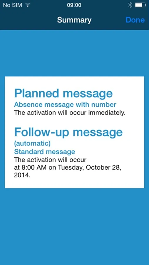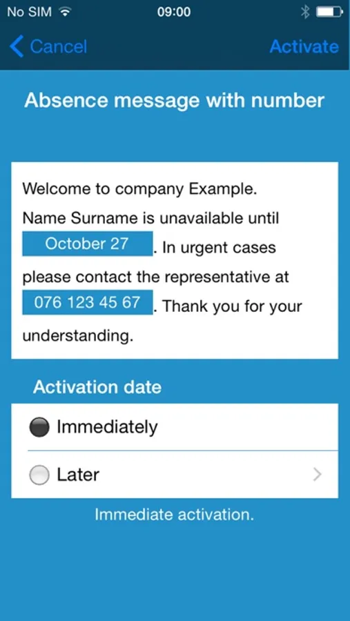 Diese Ansage verwenden Sie beispielsweise, wenn Sie einen oder mehrere Tage nicht erreichbar sind und eine Vertretungsnummer angeben wollen. Sie können das genaue Datum Ihrer Rückkehr eingeben. Der Anrufer kann eine Nachricht hinterlassen und ist gleichzeitig informiert darüber, dass er nicht vor dem erwähnten Datum mit einem Rückruf von Ihnen rechnen darf. Wenn der Anrufer nicht so lange warten will, hat er die Möglichkeit, sich an die Stellvertretung mit der erwähnten Vertretungsnummer zu wenden.