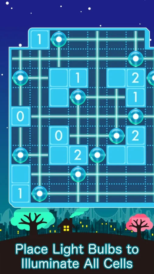 Tap any cell on the screen to place a light bulb in it. Light beams from the light bulb spread out in four directions and illuminate all cells in each direction.