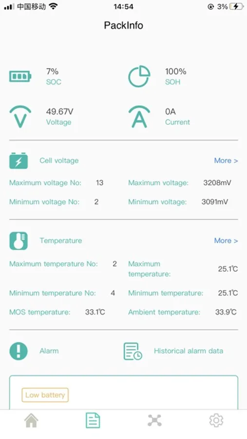 Easy BMS can be accessed anytime and anywhere on a mobile phone by opening an app and connecting the battery to view detailed data such as voltage, current, temperature, capacity, SOC, etc. It can also upgrade the BMS firmware and set parameters