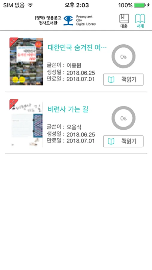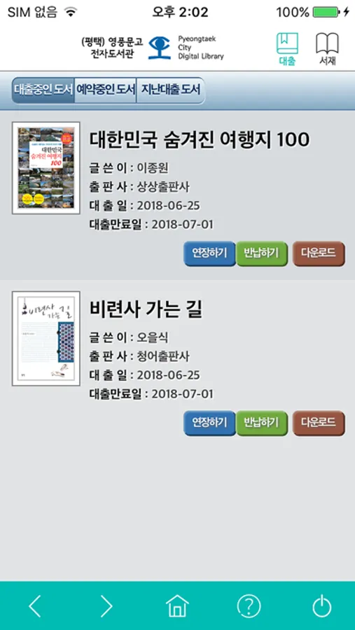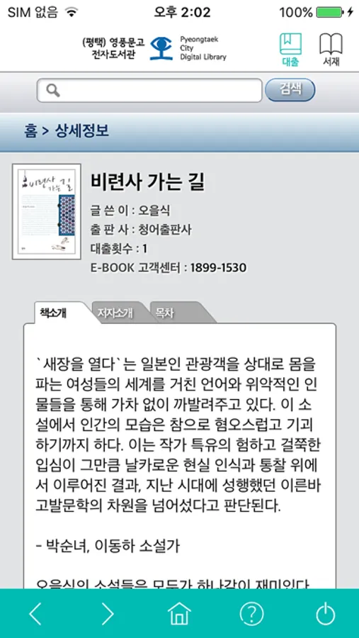 평택시립 도서관 대출회원으로 인증한 이용자를 대상으로 전자책 서비스를 제공합니다. 전자책을 검색, 대출하여 스마트폰을 통하여 언제 어디서든지 책읽기가 가능합니다.