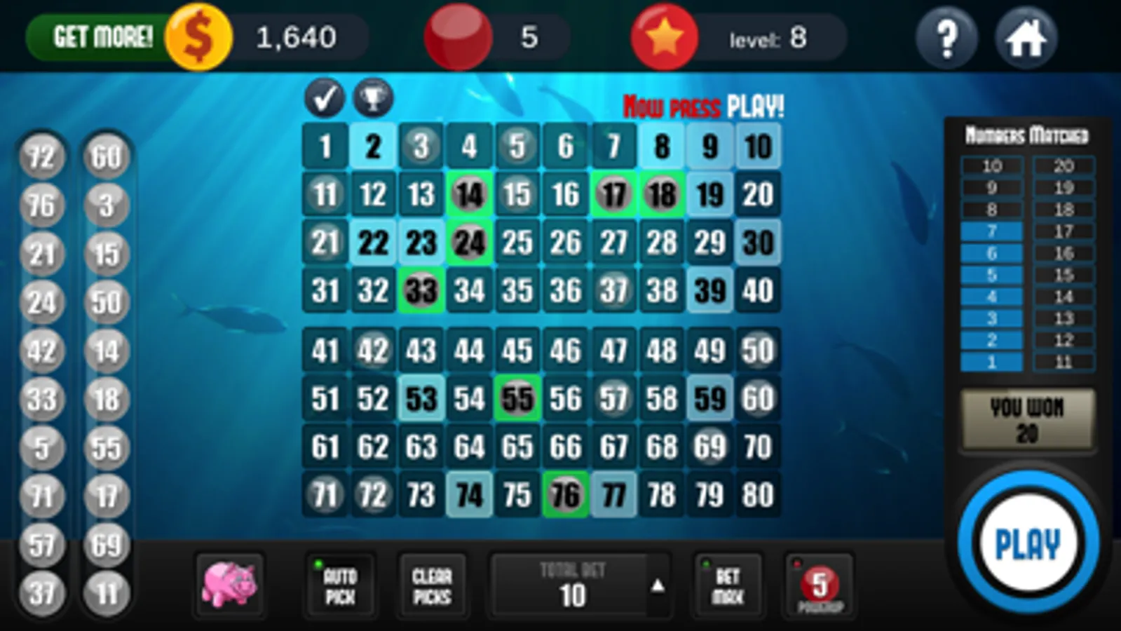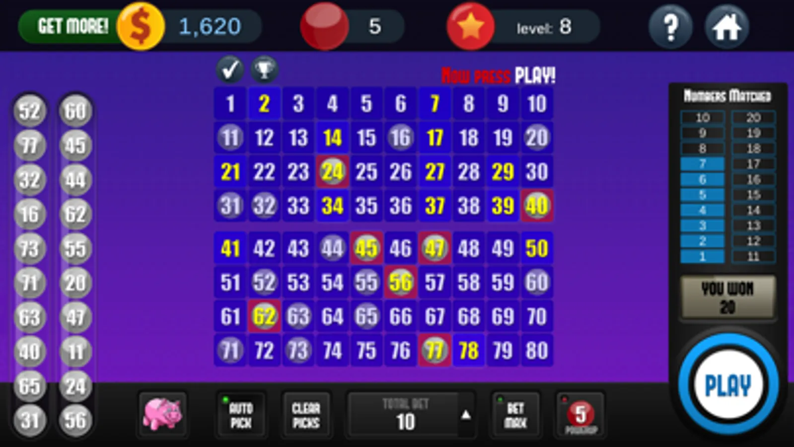 • PICK 1 to 20 numbers out of 80 numbers and see how many you match!