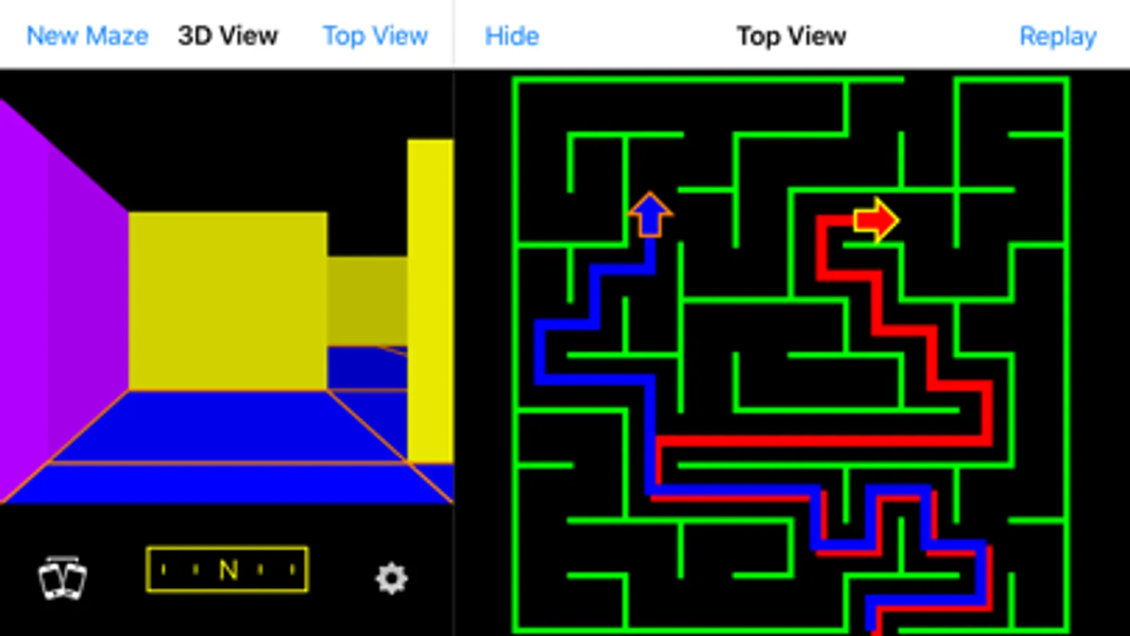 Maze Walk generates random mazes for you to solve by moving through them. Maze Walk puts you inside the maze to test your skills at navigating. You can connect two devices within a Wi-Fi network to race through the maze, or choose not to race and just work together to find the exit. Swipe your finger across the display to move. Chose from five different maze sizes. A top view is available (except when racing), in case you get lost. Use the replay button to see how you did.