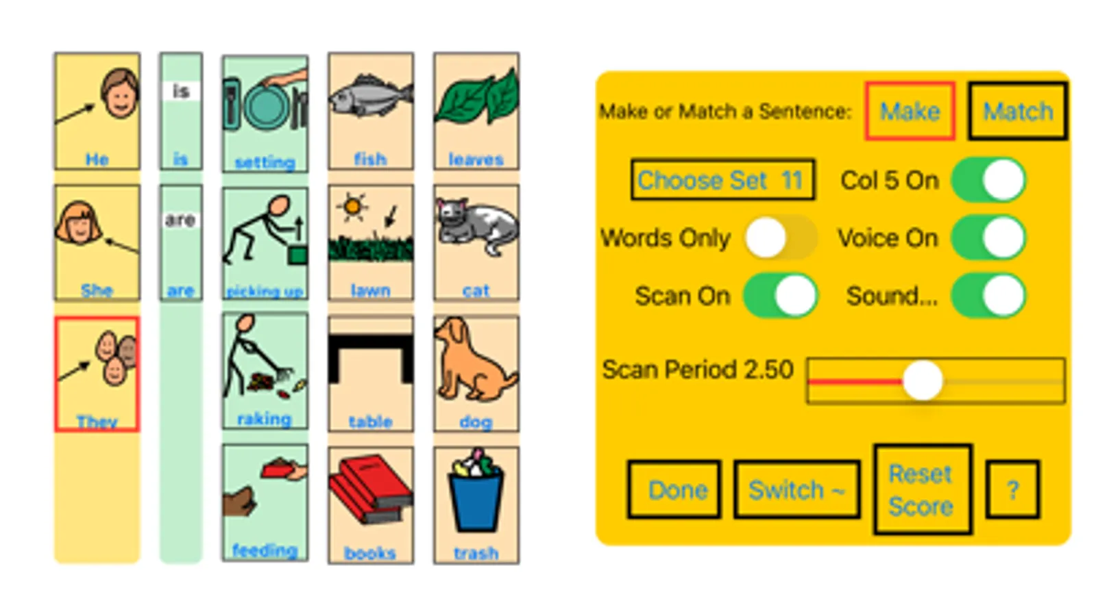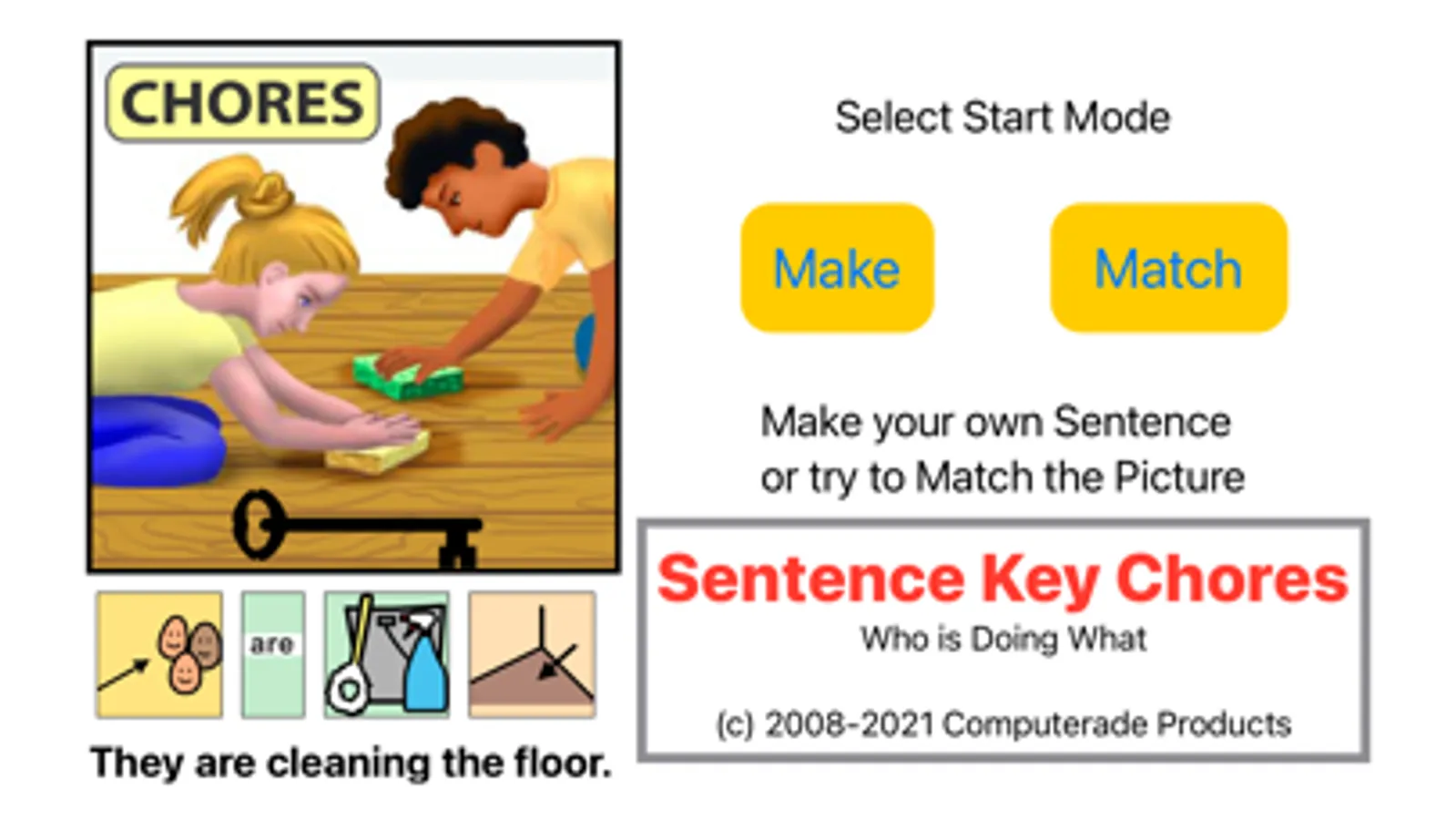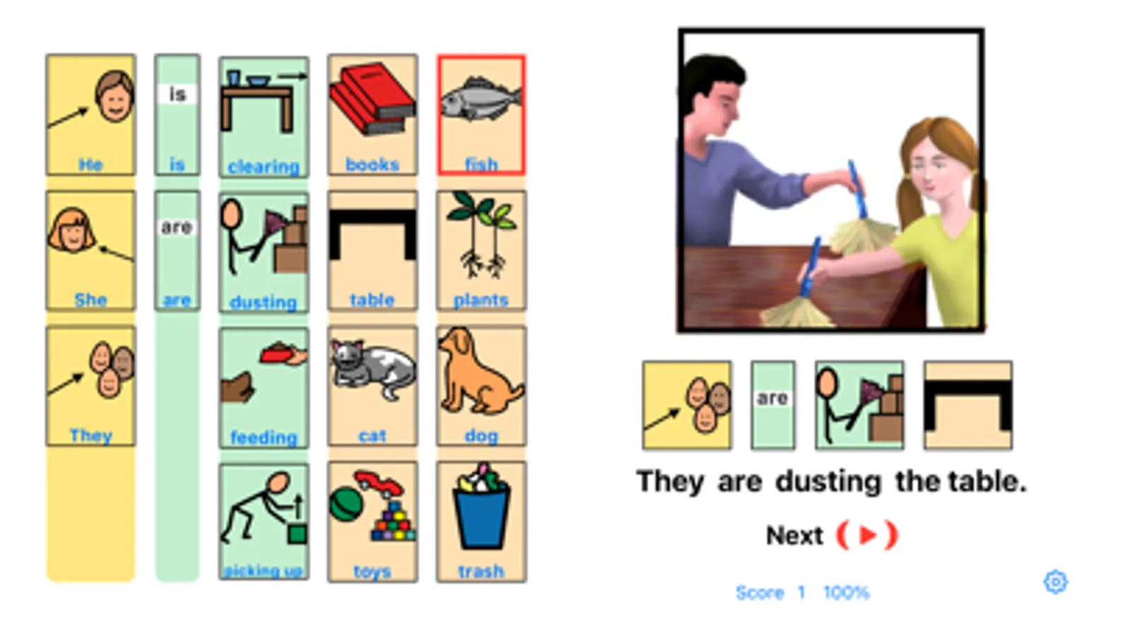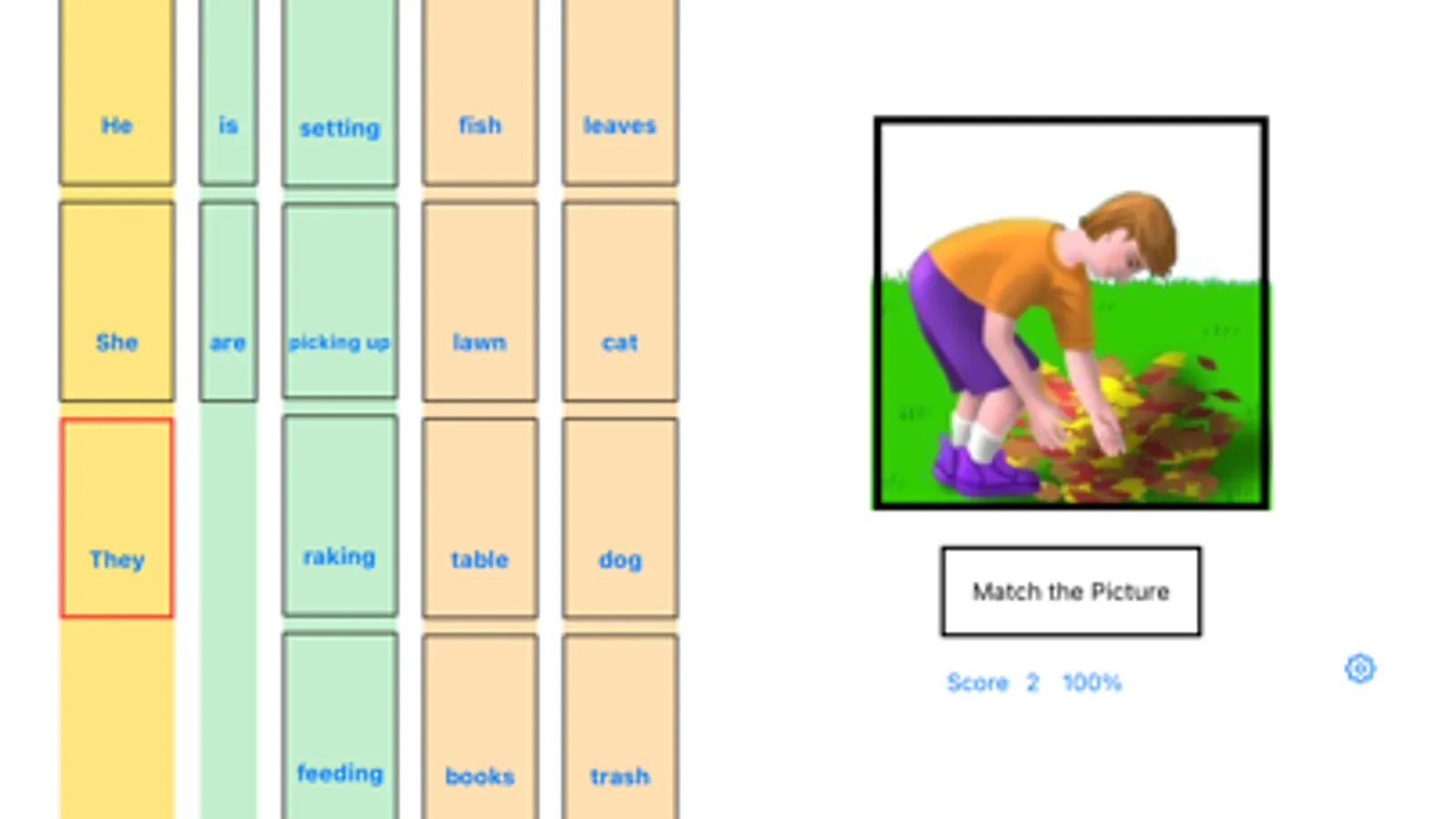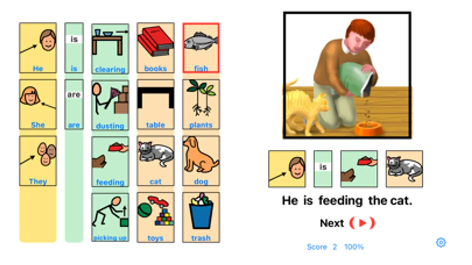 The object is to select the four most meaningful components of a sentence which follows the structure WHO IS DOING WHAT. Successful completion of a possible sentence is rewarded by a short animation combined with the spoken sentence. The learner is able to explore choices until successful. Stars can be earned when a sentence is made with no wrong choices.