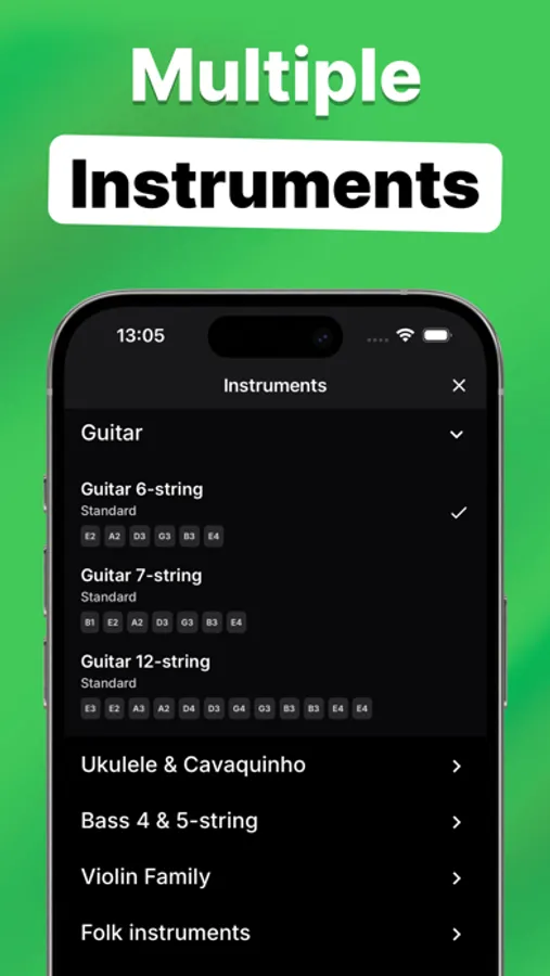 • Supports over 100 tunings across 15 different instruments, including guitar, bass, violin, ukulele, and more.