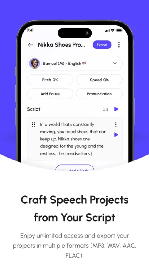 Create polished audio from your scripts with ease. Export your projects in formats like MP3, WAV, AAC, or FLAC—perfect for podcasts, videos, and more.