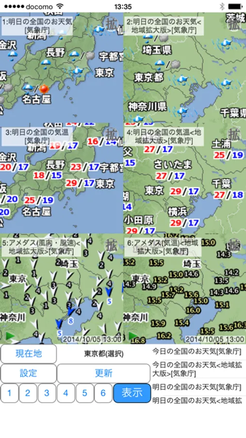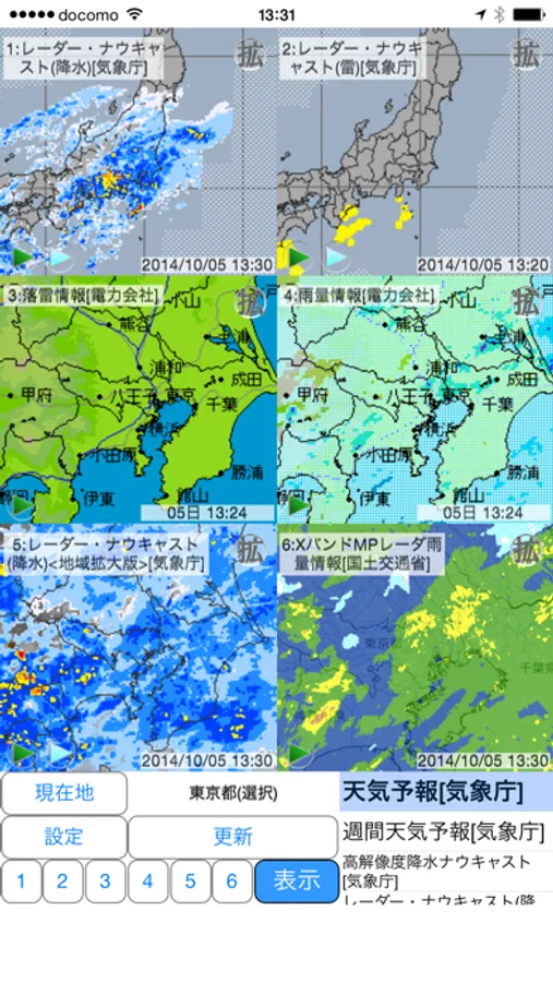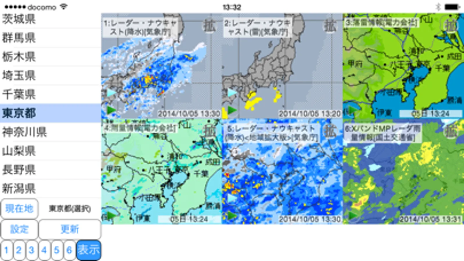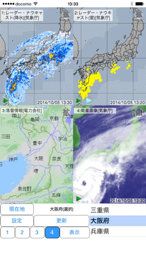 ・6分割・又は4分割の画面による雨・雷・竜巻・衛星画像などの同時表示により