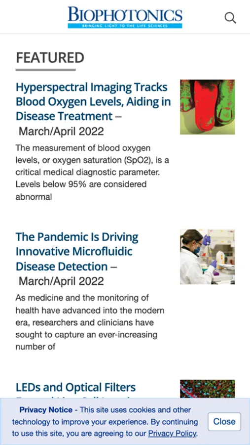 Every issue of BioPhotonics brings the latest in lasers, optics, imaging, microscopy, spectroscopy, lighting, and other biophotonic technologies. The magazine is at the forefront of a coming transformation, bringing light-based technologies to medical research, diagnosis, and treatment. It is written for an audience of researchers, engineers, and clinicians.