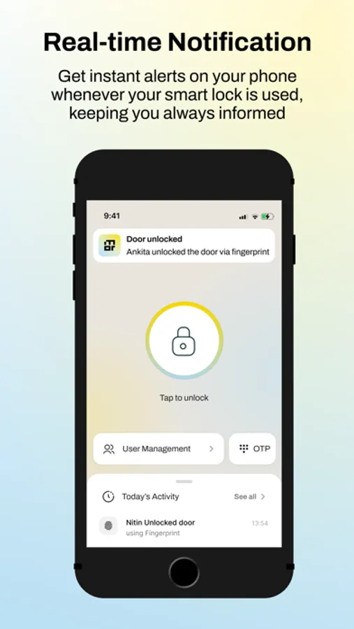 Real-Time Notifications: Get instant alerts on your phone whenever your smart lock is used, keeping you always informed.