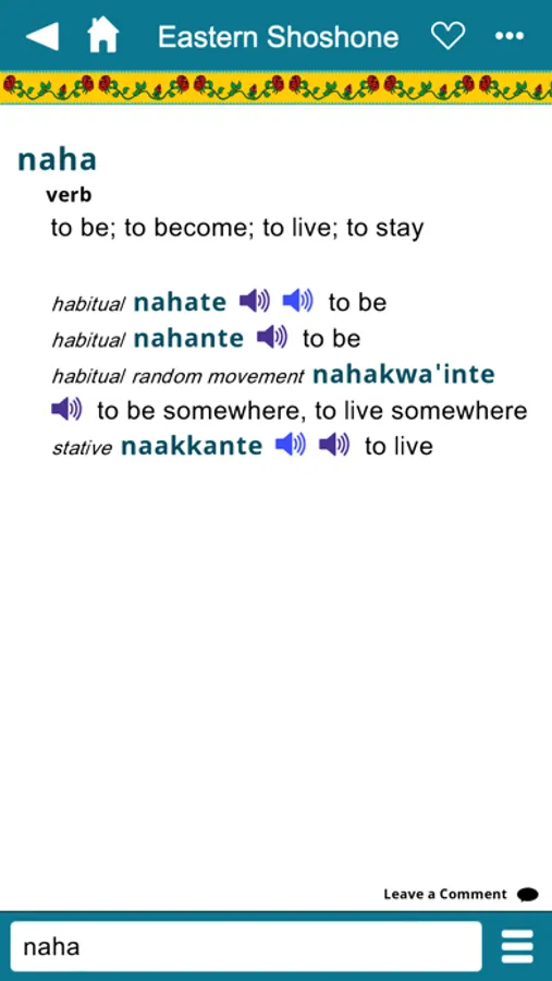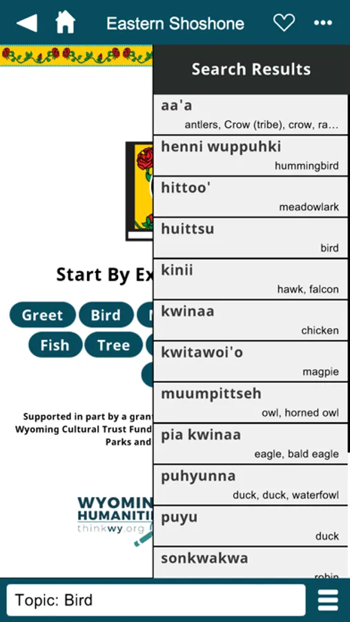 The Eastern Shoshone Mobile Dictionary is the best way to look up Eastern Shoshone words and hear pronunciations while on the go. It’s an excellent Shoshone learning and reference tool.