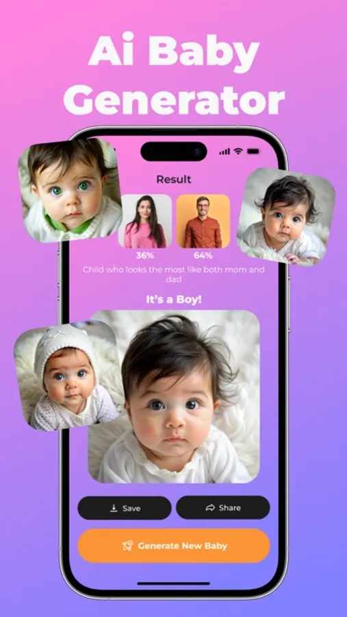 Meet our unique app that predicts your future baby's appearance by analyzing the facial features of both parents. Feel the magic of the future with our cutting-edge AI technology! Visualize how your future child might look and uncover insights into their potential personality traits.