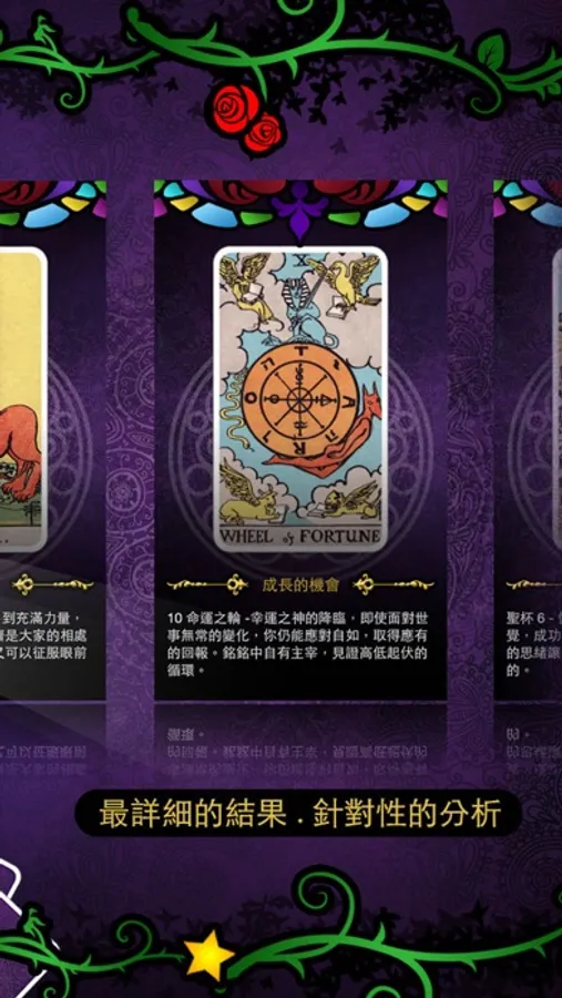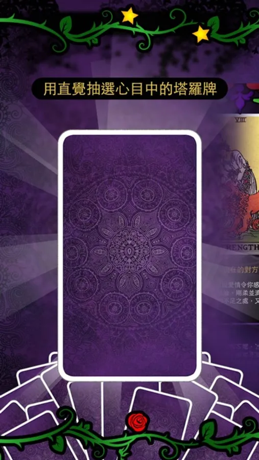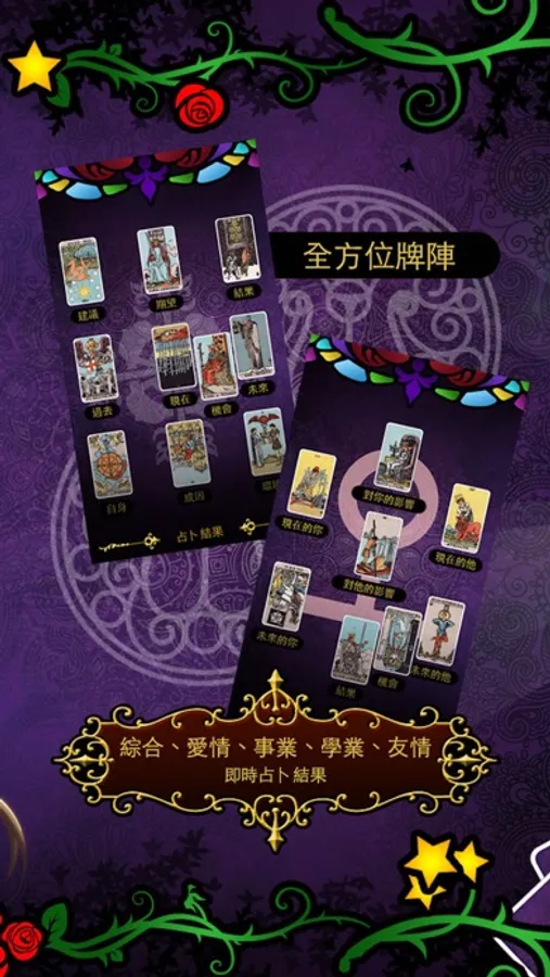 最精美、最全面的塔羅 App,為你提供最受歡迎的專業占卜牌陣,包括:維納斯愛情占卜法,塞爾特十字占卜法,過去,現在及未來占卜法,針對性的詳細解釋,從愛情、事業、學業、友情的角度為你剖析問題的成因及未來。