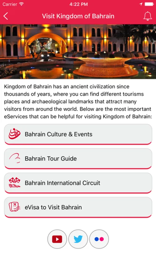 This application provided by Ministry of Foreign Affairs in collaboration with Inforamtion and eGovernment Authority allows the citizens, residents and visitors of the Kingdom of Bahrain to benefit from the following services: