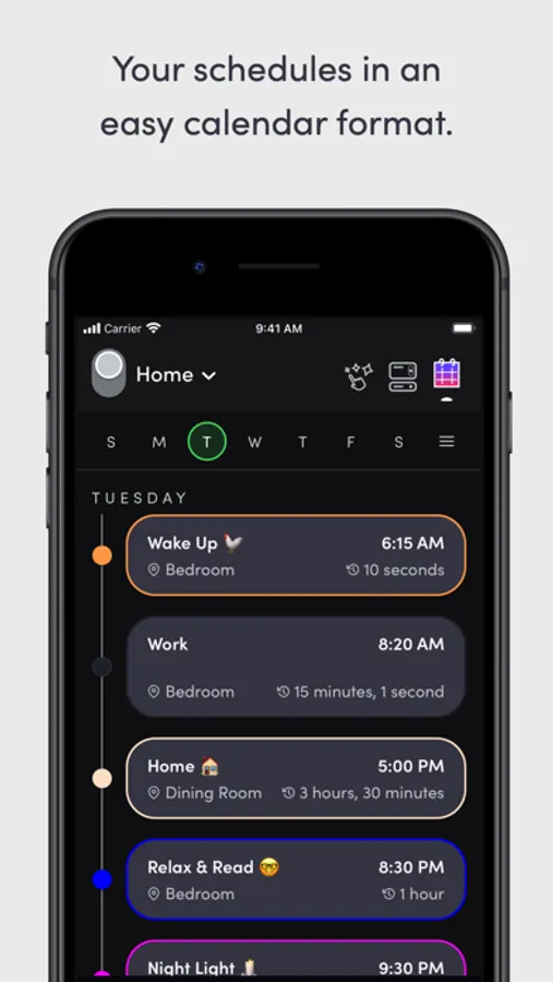 - Schedules: automate your lights to fade, change color, and turn on/off, all visible in an easy calendar-style view.