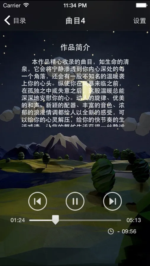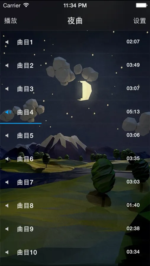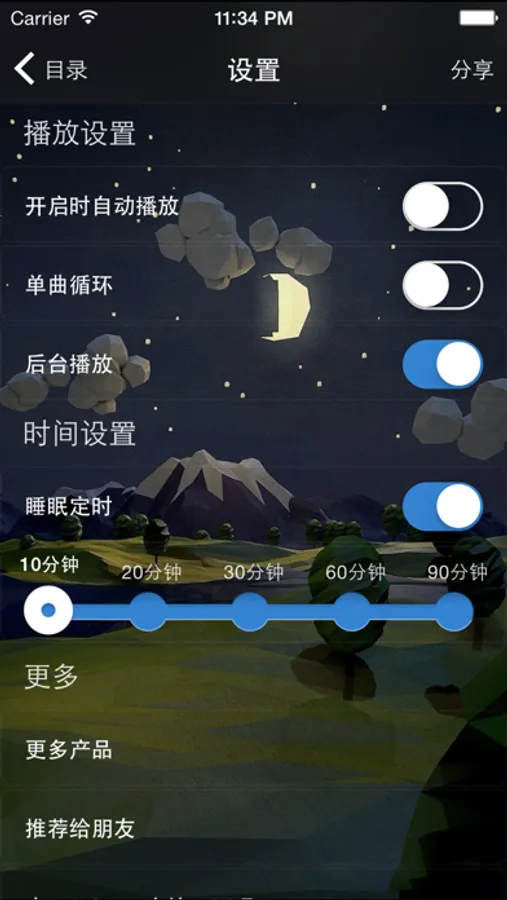 ◆睡眠定时:设定自动关闭播放时间,时长从5分钟到3小时,到时自动关闭播放。