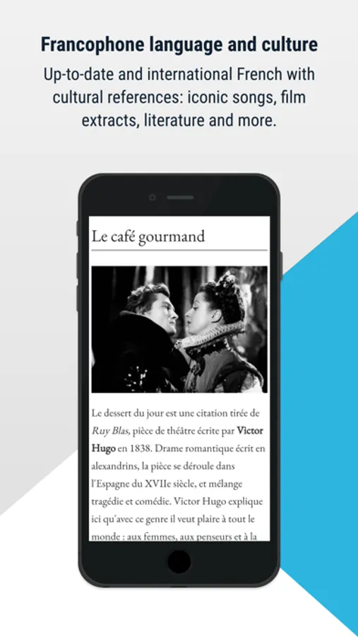 Motivation, Humor and French Culture: Discover the diversity and richness of French culture around the world with the help of Victor Hugo and friends. Every day, you'll come across different accents, songs, and films in addition to original stories and texts.