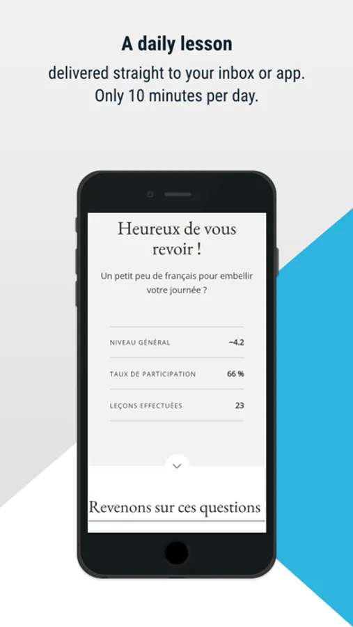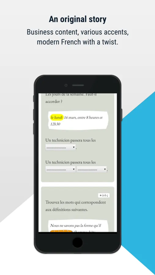 Personalized French content: Frantastique lessons are based on your needs, your requests, and your level. You’ll come across professional scenarios, a variety of accents, exercises and plenty of humor. 10 to 15 minutes daily is all it takes!