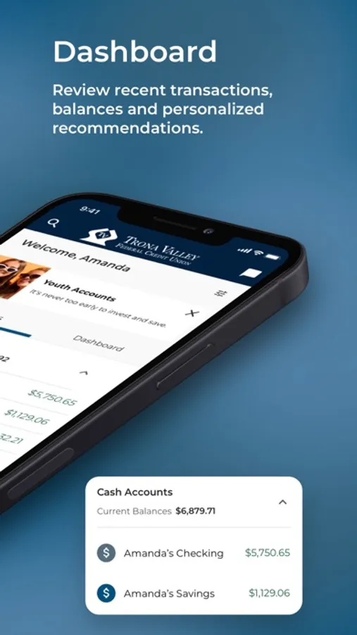 Dashboard - Manage all of your Trona Valley FCU accounts in one easy to view dashboard. View available funds, the progress of savings goals, upcoming payments, how much you’ve deposited, and personal recommendations all in one simple and easy to read screen.