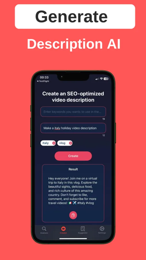Our AI-powered description generator crafts engaging, SEO-optimized video descriptions in seconds. Stand out from the crowd and boost your video's visibility with keyword-rich content that drives subscriber growth.