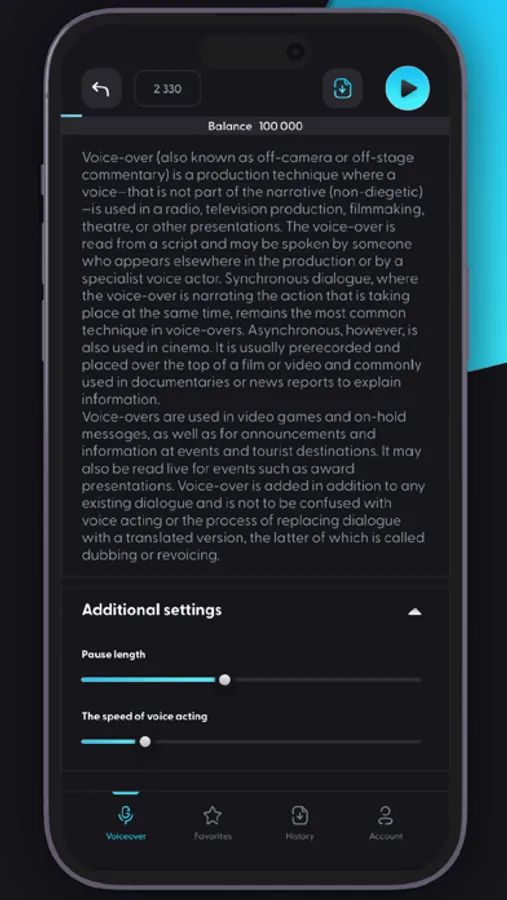 Immerse yourself in a world of creativity and diversity with the Voicer app! Transform text into unique vocal melodies, infuse them with individuality using various settings, add fun with voices of famous characters, and even incorporate emotional accents. Plus, Voicer is the perfect tool for narrating audiobooks!