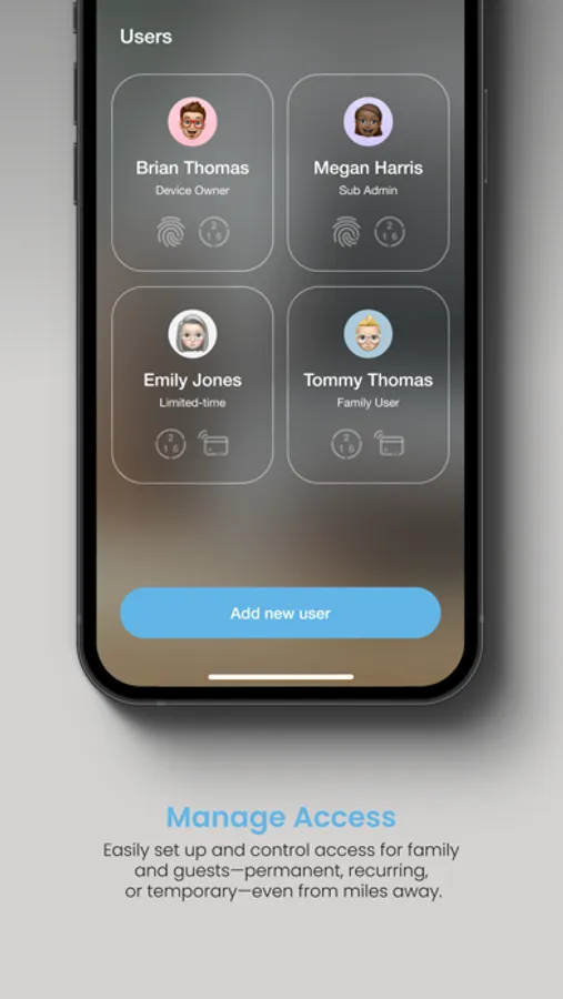 Easily set up innovative features like facial recognition with Lockly Visage, or enjoy live view, video recording, and intercom calls with Lockly Vision and Lockly Vision Elite. Create personalized access for family, friends, and guests using fingerprints, access codes, eKeys, eBadges, and more.