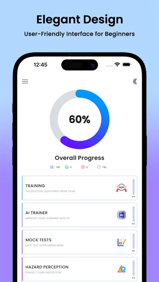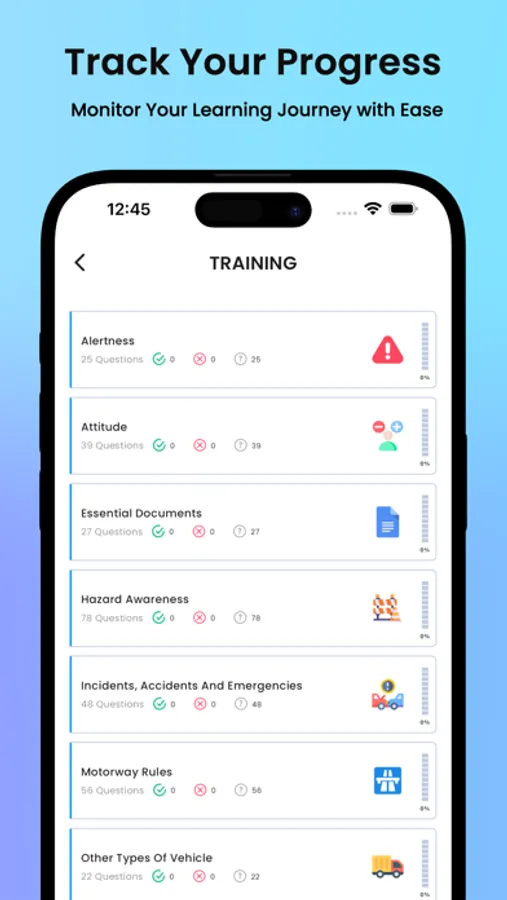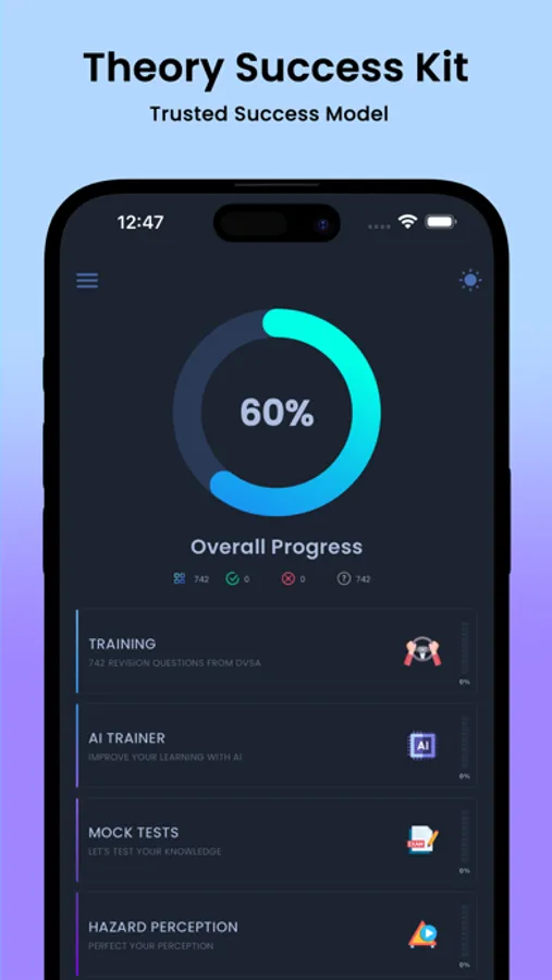 Ace your driving theory test with our mock exams that mirror the real exam environment. Our advanced AI trainer monitors your progress and delivers tailored feedback to help you improve and excel.