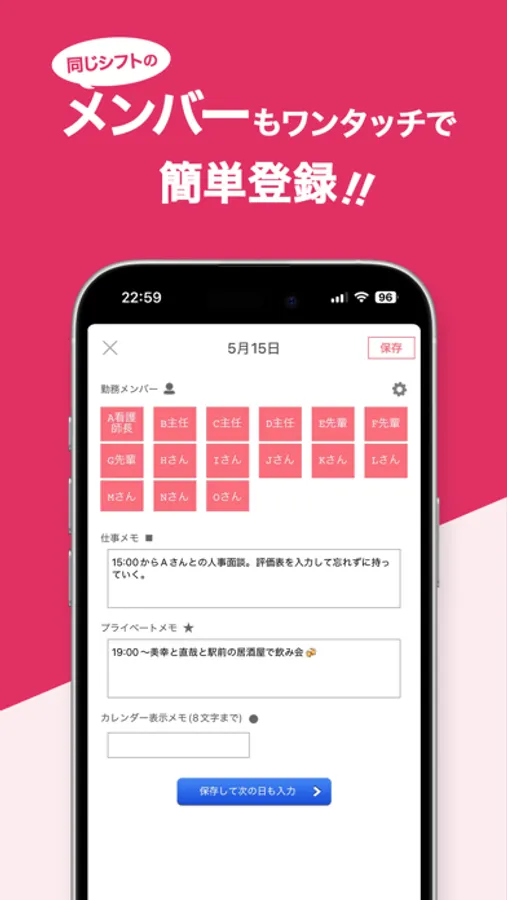 ・メモ機能:看護師業務のメモをカレンダーに保存。シフト以外の情報も管理