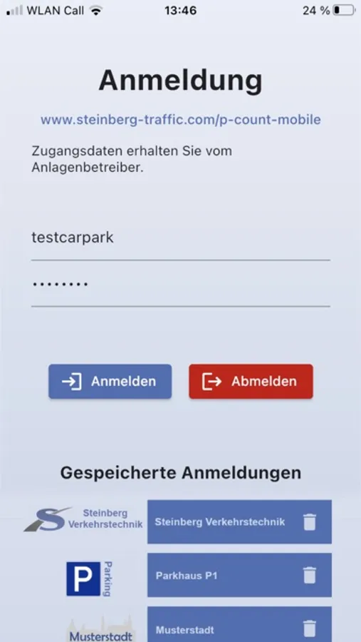 Die Zugangsdaten zum Parkdatenerfassungssystem erhalten Sie vom jeweiligen Anlagenbetreiber.