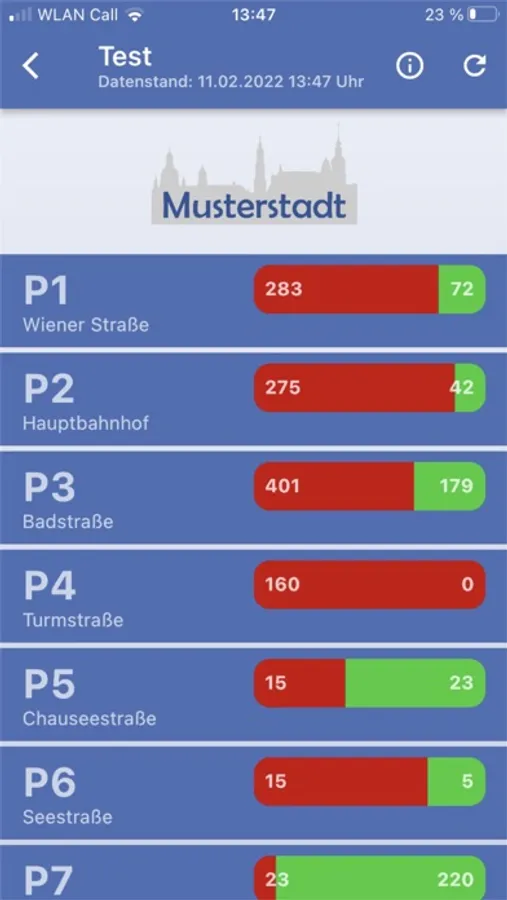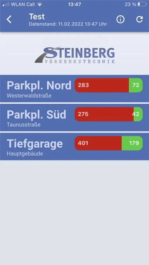 Die App stellt universell die Belegungsdaten von Parkplätzen und Parkhäusern dar. Sowohl städtische als auch lokale Parkdatenerfassungssysteme werden unterstützt. Eine Liste der Parkerfassungssysteme finden Sie unter www.steinberg-traffic.com/p-count-mobile. Die Belegungsdarstellung erfolgt leicht ablesbar als Rot-Grün-Balken und numerisch.