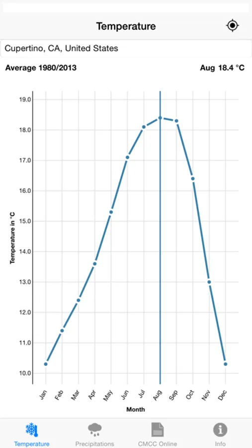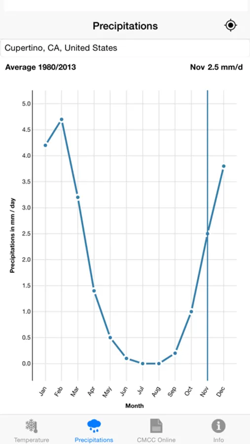 Data are visualized in a line chart that provides average temperatures (°C) and precipitations (mm/day) for the 1980 – 2013 period, thus providing the climate information of the last decades for any place in the planet.