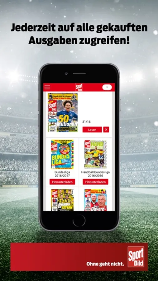 Mit dieser App können Sie die aktuelle Ausgabe der SPORT BILD für 1,99 Euro kaufen. Alle in der App gekauften Ausgaben bleiben erhalten, so dass Sie auch zu einem späteren Zeitpunkt jederzeit in älteren Ausgaben stöbern können.