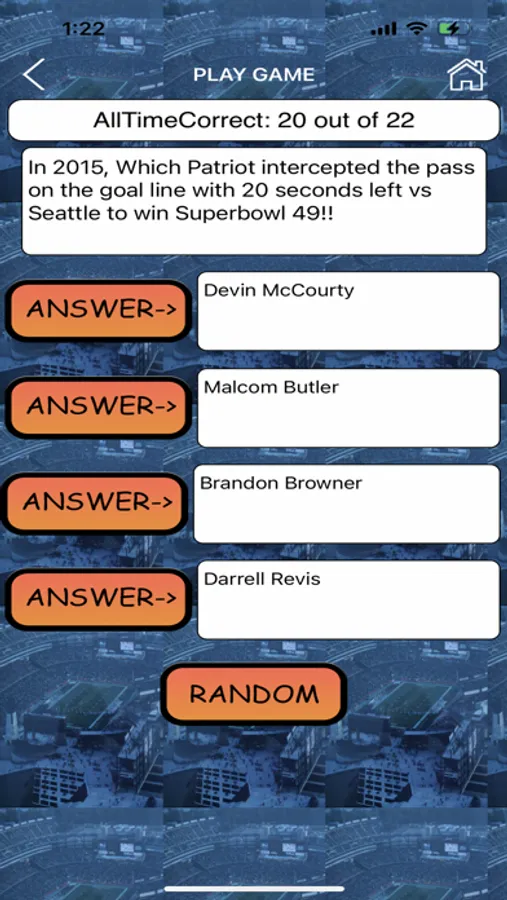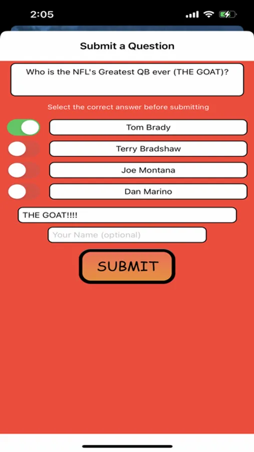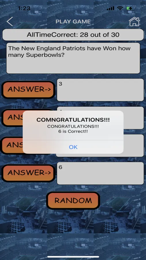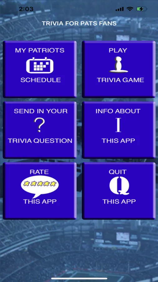 Also, test your skill! How much do you know about the NE Patriots football team? We have hundreds and hundreds of Patriots trivia questions from old time pats trivia to present day trivia that will challenge you. You can also send in your own Patriots Trivia question and we will put it in the database of the app with your name on it if you would like. We also keep a running score so you can challenge yourself. Please tell your friends on facebook about this app, the more people who play the game and send in trivia questions the better the app will be for all Patriots fans!!