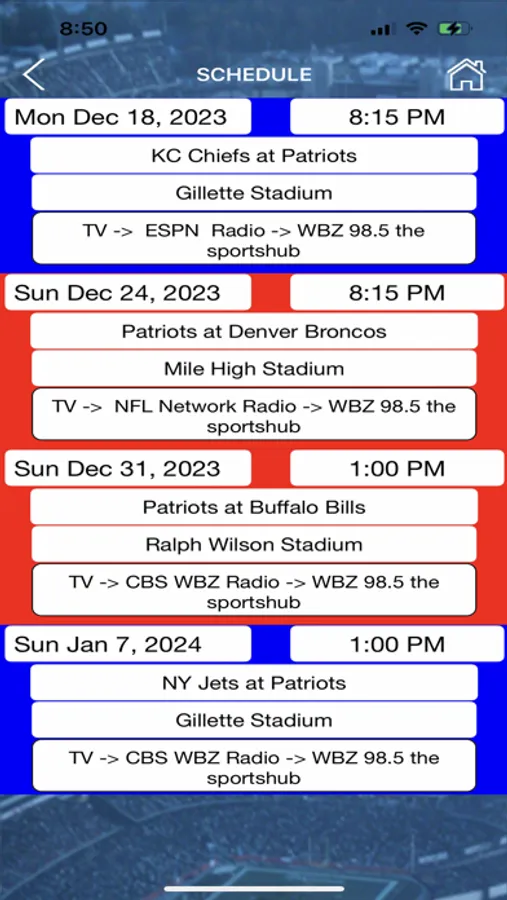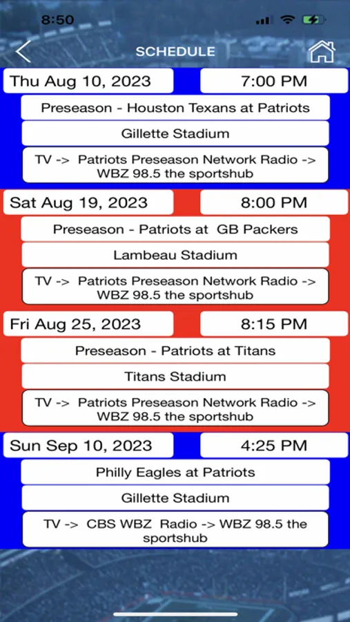 This app has the schedule for Patriots fans with TV and radio listings as well as a fun and challenging Trivia game! Wicked die hard Patriots fans will love this very fast, small, and free app. So when you are walking around BeanTown and someone says “"When is the next Patriots game and who do they play?”. One tap of your iPhone and there is the answer! No thumbing through old months, this app knows today's date and quickly shows the next set of games from today's date to the end. This app will show the schedule even if you have no wifi access! One tap on any game takes you to a Patriots web site for scores, highlights, blogs, and all the details (need internet connection or phone service for this).